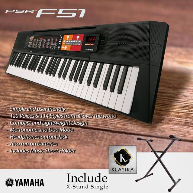 With 61 keys and basic features its an easy choice for a first keyboard61 full sized keys are great for learning and developing keyboard playing technique. The psr f51s compact and lightweight design packs in a regular size keyboard together with 120 voices and 114 rhythms from all over the world. With 120 voices 114 styles the psr f51 is amazingly versatile.